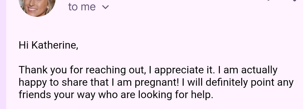 Fertility is such a personal and sensitive journey, and having Katherine by my side was essential. She listens without judgment and truly makes you feel heard and understood. It was incredibly comforting to know I had someone in my corner who was there to support me, guide me, and deliver real results.