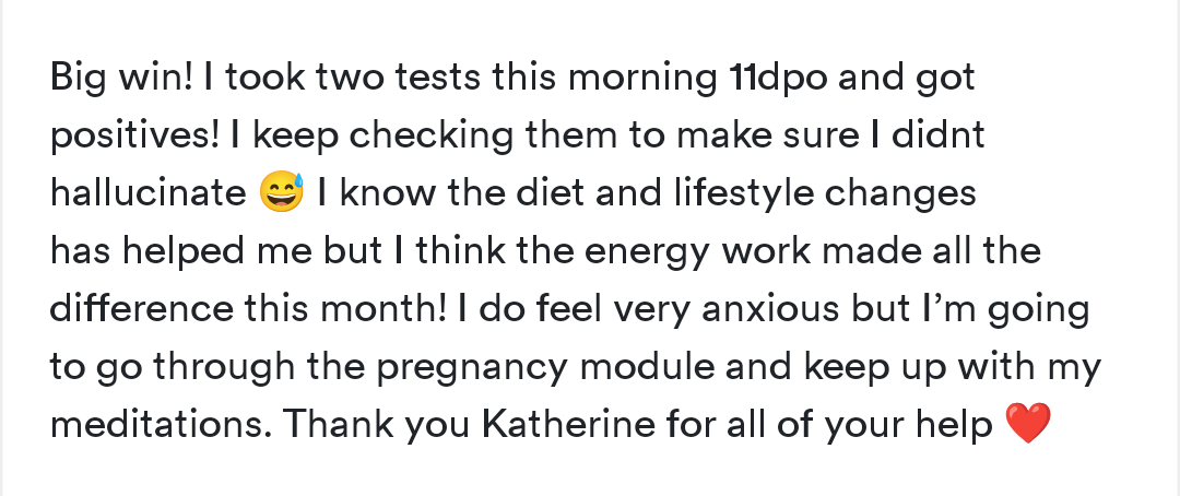 I got a positive pregnancy test within one month of working with Katherine. I started working with Katherine remotely after a late term pregnancy loss and then struggling to get pregnant again. I was worried that I wouldn’t be able to get pregnant again and then what would happen if I did get pregnant again. I lacked confidence and trust in myself and my body and felt very lonely.